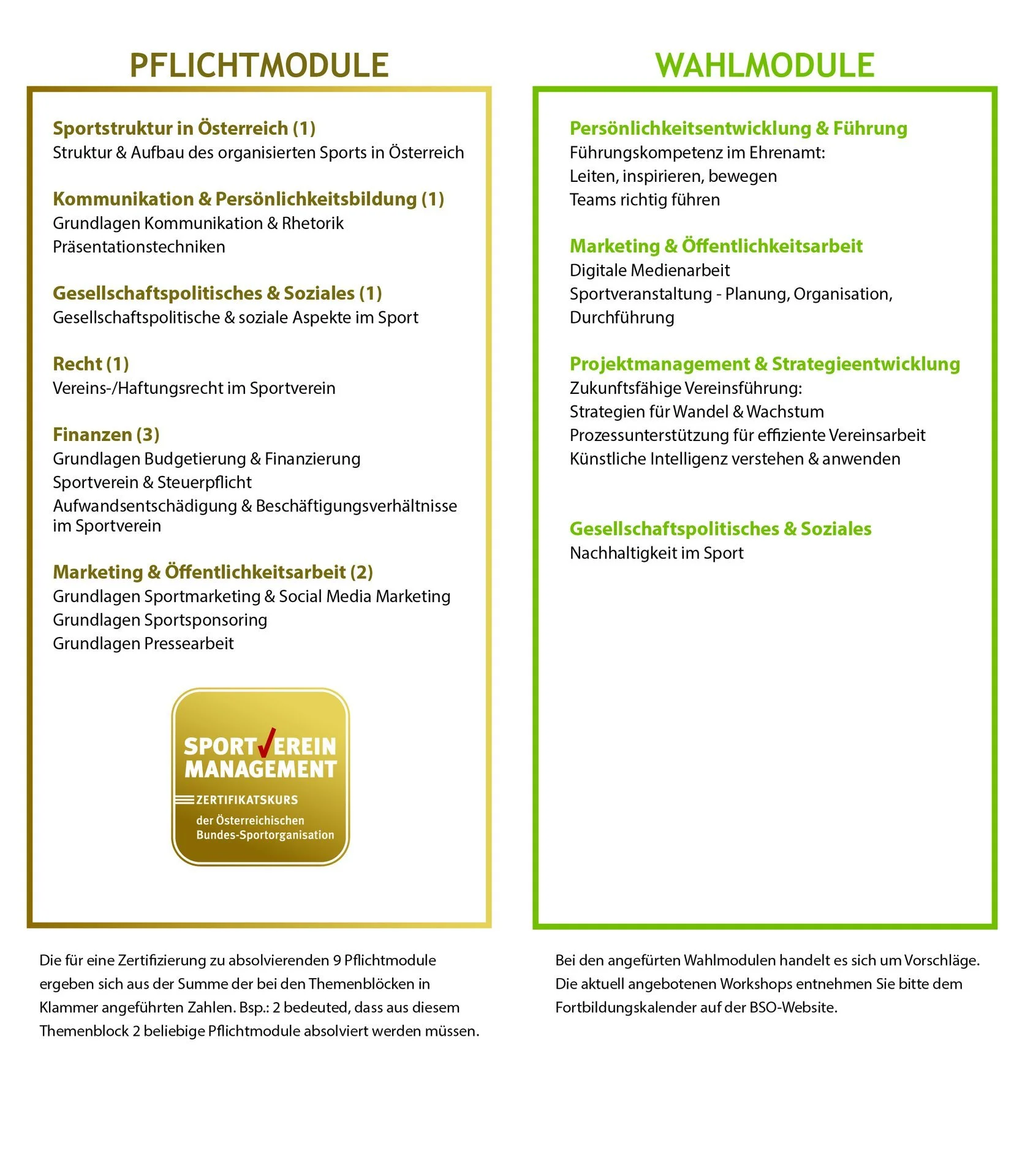 Um sich zertifizieren lassen zu können, musst du insgesamt 11 Workshops, davon 9 Pflichtmodule und 2 Wahlmodule, absolvieren. Dabei ist darauf zu achten, dass aus den unterschiedlichen Themenblöcken eine bestimmte Anzahl an Workshops besucht werden muss (siehe Grafik unten).